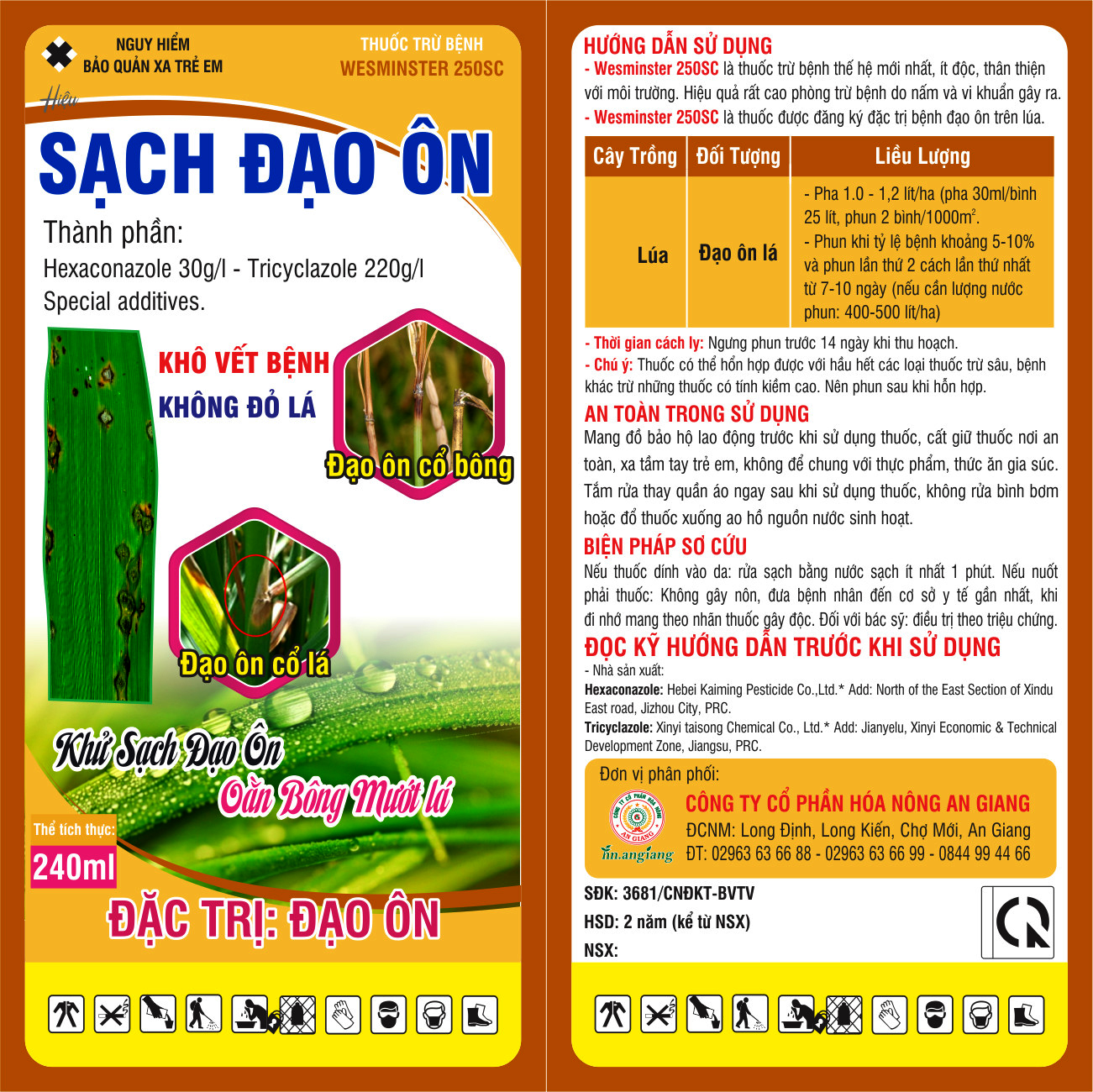 - Đối với bệnh đạo ôn cổ lá, cổ bông, cần theo dõi chặt chẽ thời gian lúa vào trỗ. Ruộng đạo ôn lá đã chữa trị khỏi thì ruộng đó ít nhiều cũng sẽ bị bệnh đạo ôn cổ lá và cổ bông, do đó bước vào giai đoạn bắt đầu trỗ (trổ vè) đều phải phun thuốc. Nếu điều kiện thời tiết thuận lợi cho đạo ôn cổ bông phát triển gây hại cần phun phòng cho các ruộng gieo cấy giống nhiễm, ruộng lúa xanh tốt, thừa đạm… trước khi lúa trỗ 5 - 7 ngày, nhất là khi trỗ gặp điều kiện nhiệt độ dưới 28°C, tiết trời râm mát, sương mù hoặc có mưa nhỏ, mưa rào; Bà con nên kết hợp phun thuốc phòng khô vằn, lem lép hạt giai đoạn đòng trổ với liều lượng và nồng độ theo hướng dẫn trên chai thuốc. Khi sử dụng thuốc BVTV, bà con cần tuân thủ theo nguyên tắc 4 đúng bao gồm: đúng thuốc, đúng nồng độ - liều lượng, đúng lúc và đúng cách. Nơi mua các sản phẩm phục vụ nông nghiệp: CÔNG TY CỔ PHẦN HÓA NÔNG AN GIANG Nhà máy: Ấp Long Định, xã Long Kiến, huyện Chợ Mới, tỉnh An Giang. VPĐD: Số 341 Hà Hoàng Hổ, p. Đông Xuyên, TP. Long Xuyên, An Giang. Điện thoại: (02963) 63 66 99 hoặc 0838 22 99 77. |